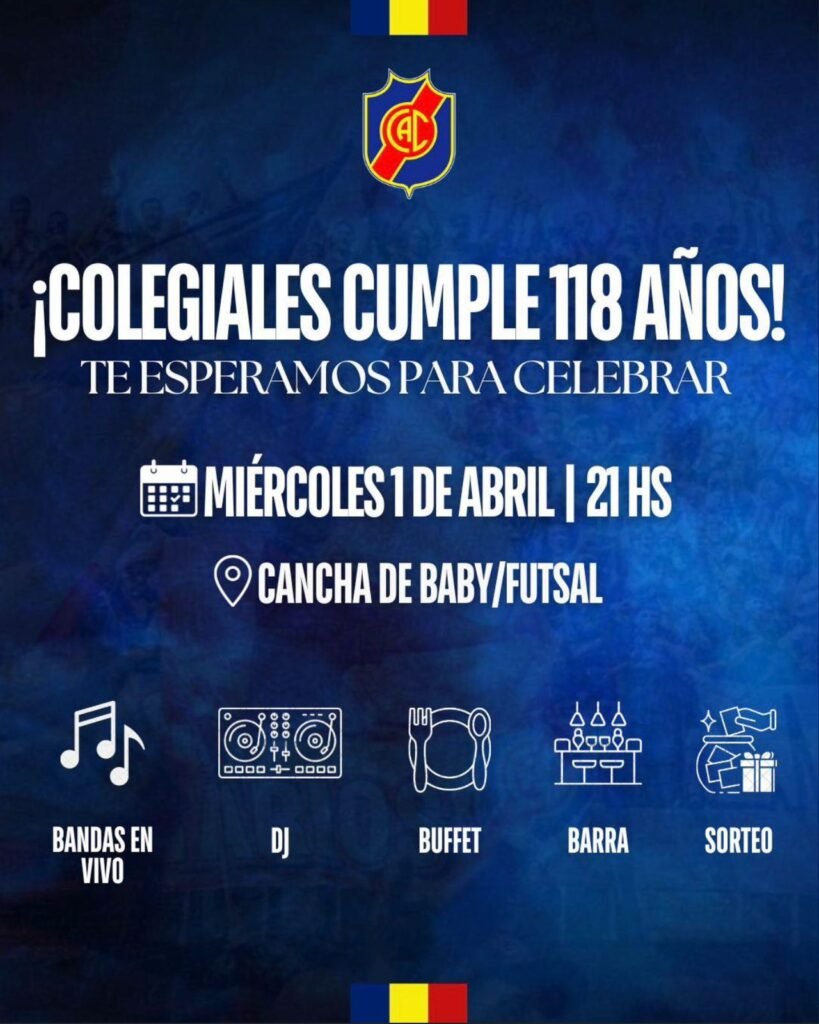 El aniversario de un club no es solo una fecha: es memoria, identidad y pertenencia. Por eso, desde el Club Atlético Colegiales invitamos a todos los socios, socias e hinchas a ser parte de una noche especial para celebrar juntos nuestros 118 años de historia.