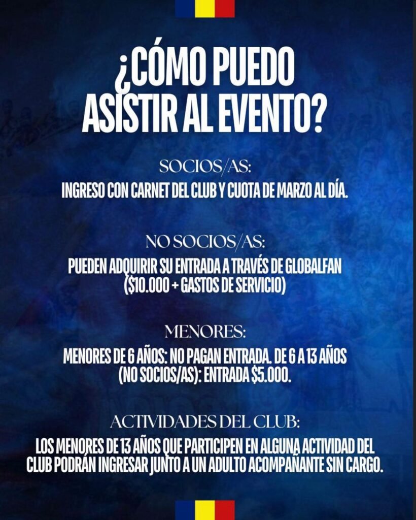 Los socios y socias podrán ingresar presentando su carnét con la cuota de marzo al día. Quienes no sean socios podrán adquirir su entrada de manera anticipada a través de https://colegiales.global.fan/eventos.