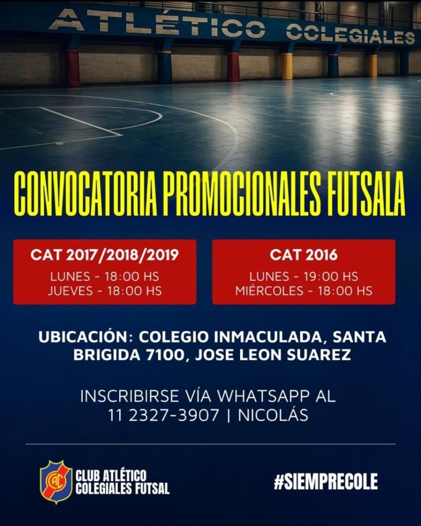 El futsal del Club Atlético Colegiales abre la convocatoria de jugadores para la 8.ª División (categoría 2015). Los interesados podrán presentarse directamente en los lugares y horarios indicados: